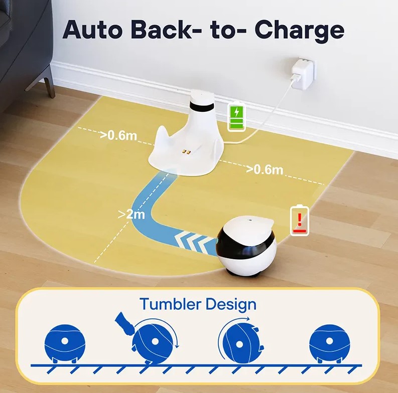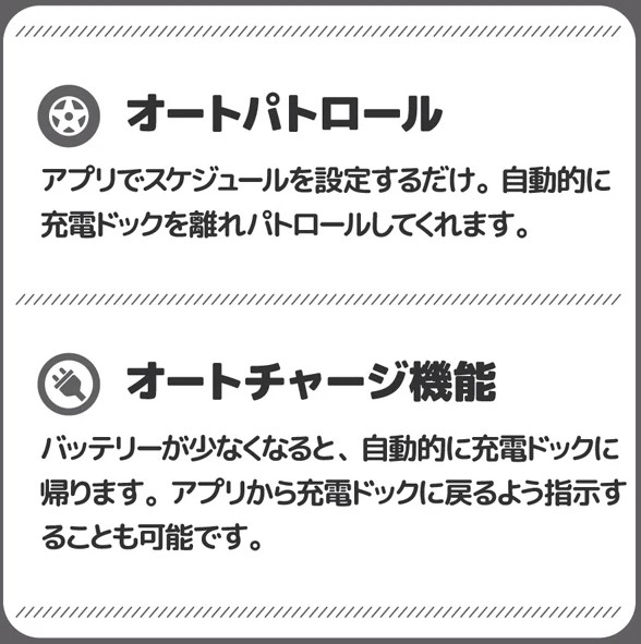 アプリでスケジュールを設定するだけで、自動的に充電ドックを離れて、家の中をパトロールしてくれます。バッテリーが少なくなると、自動的に充電ドッグに帰ります。