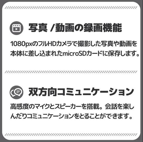 マイク・スピーカーを搭載しているので、家族と話したり、ペットと遊んだり双方向のコミュニケ―ションが可能。