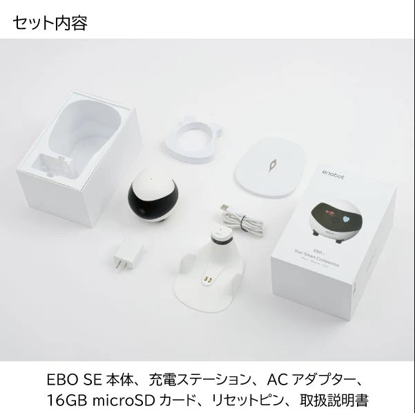 EBO本体、充電ステーション、ACアダプター、SDカード、取扱説明書他
