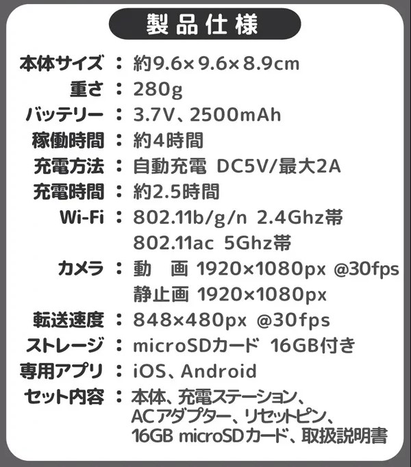 - 本体、充電ステーション、ACアダプター、リセットピン、16GB microSD